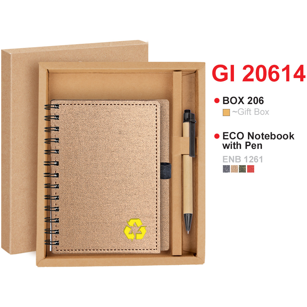 - ECO Notebook (ENB 1261): A spiral-bound notebook featuring a textured, cork-like cover. It is embellished with a vibrant yellow recycling symbol to emphasize its environmental focus.
