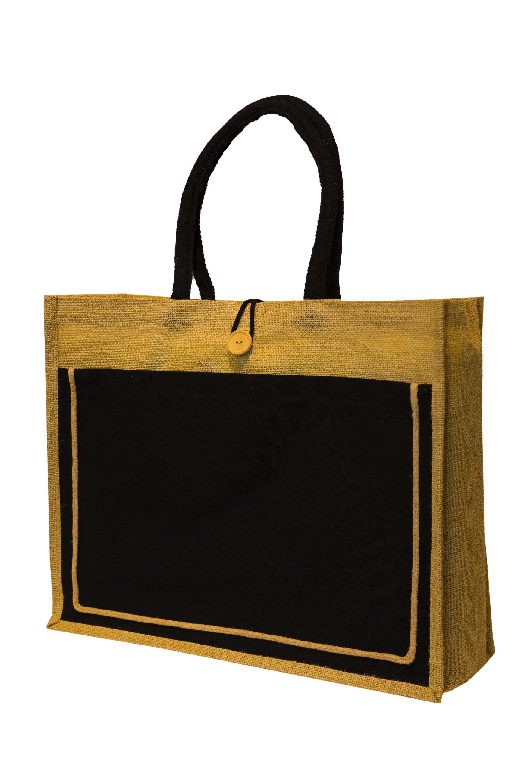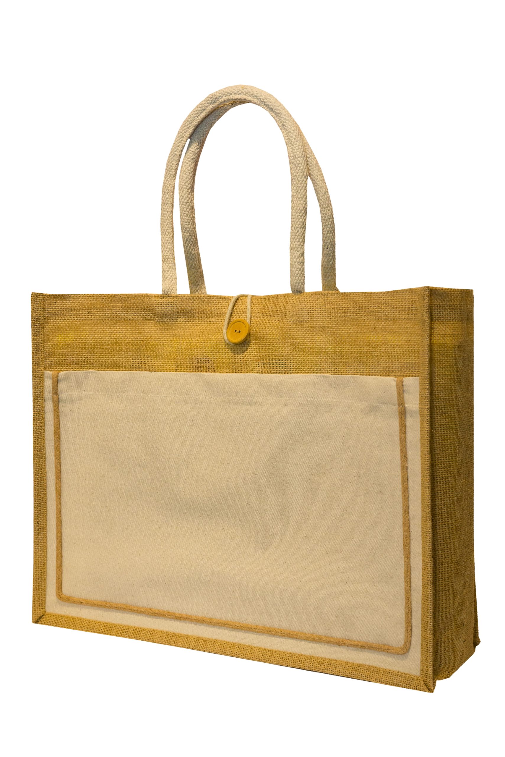 Embrace eco-chic with the JB17 Laminated Jute Bag, featuring a secure button closure. Its durable design, measuring 35x43x15 cm with a 48 cm cotton paddle handle, is ideal for custom printing, ensuring style meets practicality.