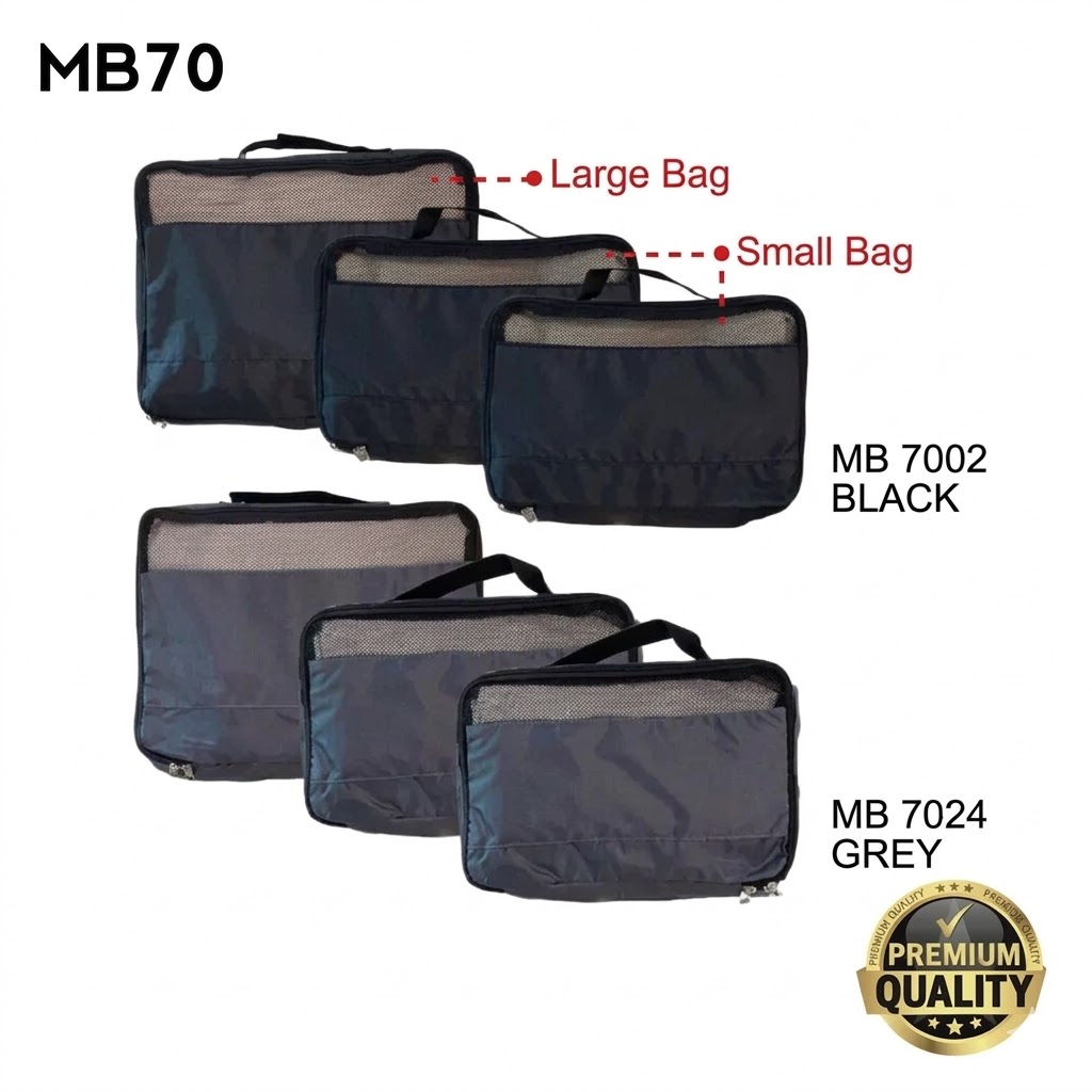 Pack smart and travel efficiently with the MB70 Travel Organizer. Crafted from durable 190D nylon, this 3-in-1 multipurpose set includes one spacious large compartment and two smaller pouches to keep your clothes neatly sorted and protected throughout your journey. Lightweight yet sturdy, it ensures hassle-free packing for business trips, vacations, or weekend getaways.